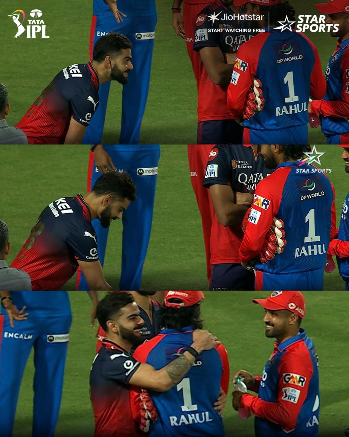 After the match, as players shook hands, Kohli walked up to Rahul and cheekily recreated Rahul’s famous celebration — pointing to the ground and thumping his chest. Rahul immediately pointed towards the ‘Virat Kohli Pavilion’ at the stadium, both players laughed, and any lingering tension between the two evaporated in a warm hug.
