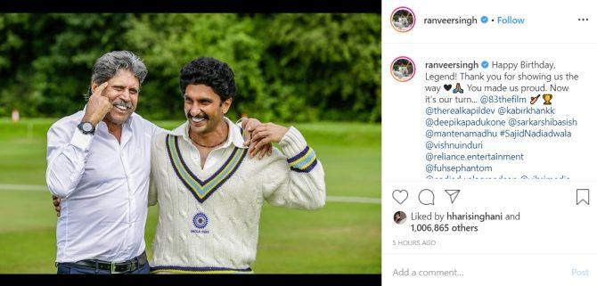 "Happy Birthday, Legend! Thank you for showing us the way You made us proud. Now it's our turn. @83thefilm," Ranveer posted on his official Instagram handle.