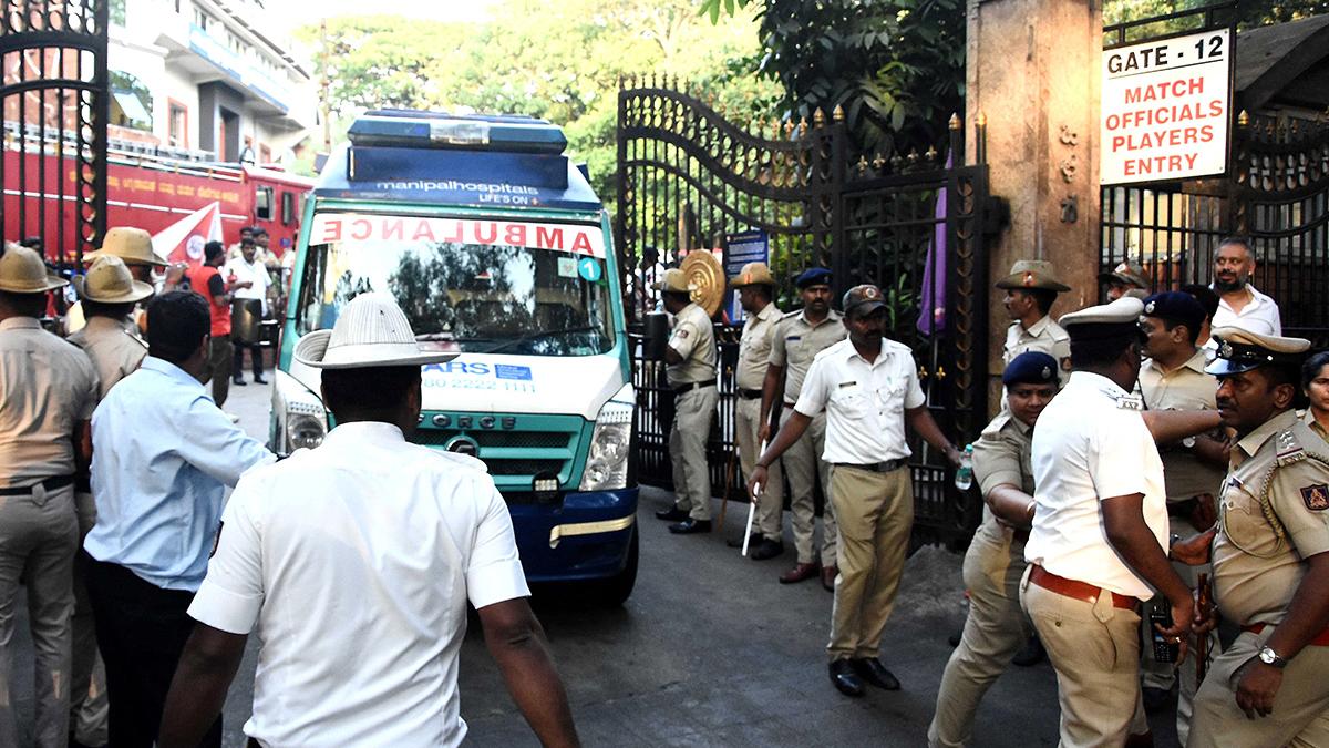 IMAGE: Police officers make way for an ambulance following a stampede at the M Chinnaswamy Stadium in Bengaluru on Wednesday. Photograph: Reuters