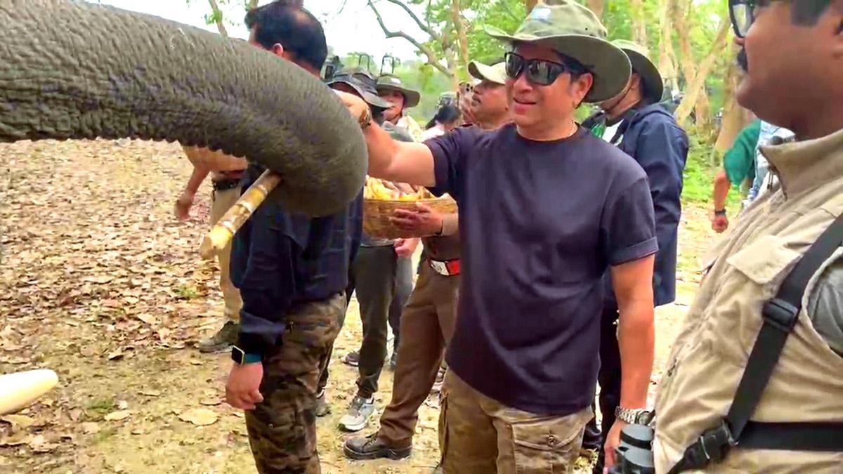 Sachin Tendulkar fed sugarcane sticks to elephants during his visit to the Kaziranga National Park in Assam on Wednesday, April 9, 2025.