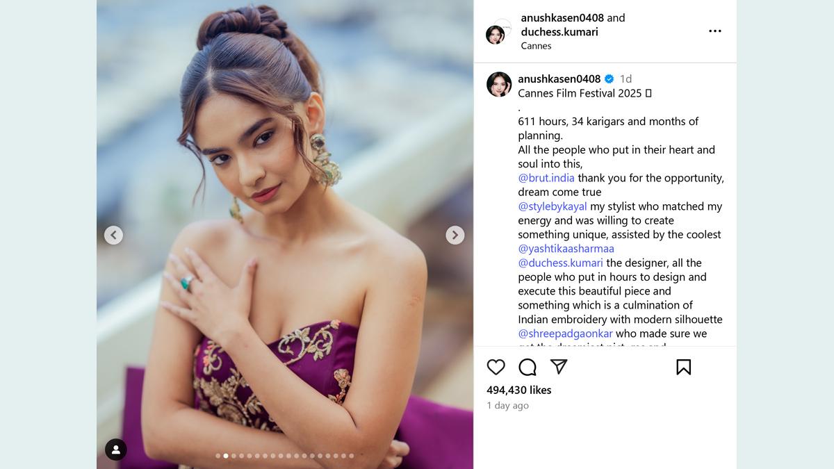 Sharing the pictures Anushka writes, '611 hours, 34 karigars and months of planning. All the people who put in their heart and soul into this, @brut.india thank you for the opportunity, dream come true.'