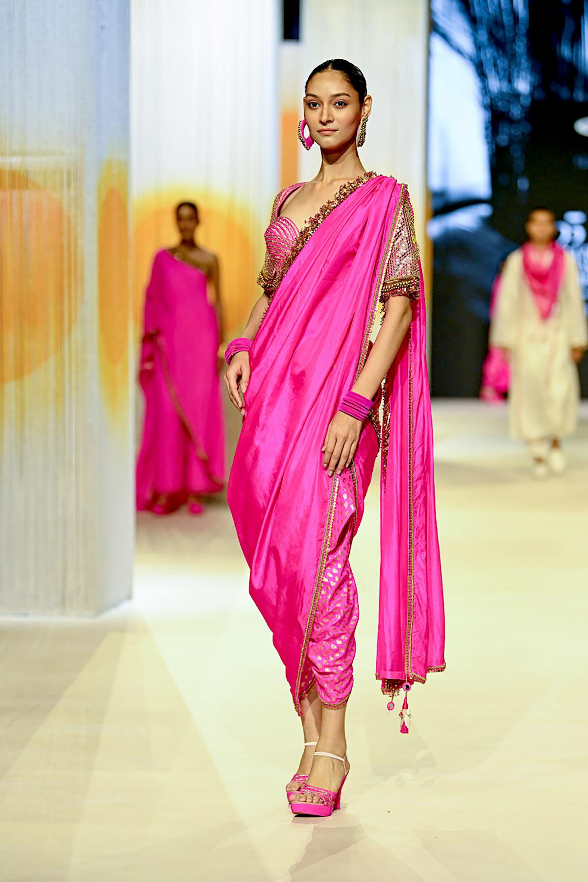 Nikasha Tawadey’s Mahboob collection showcased fluid drapes, intricate details and rich handwoven textures.