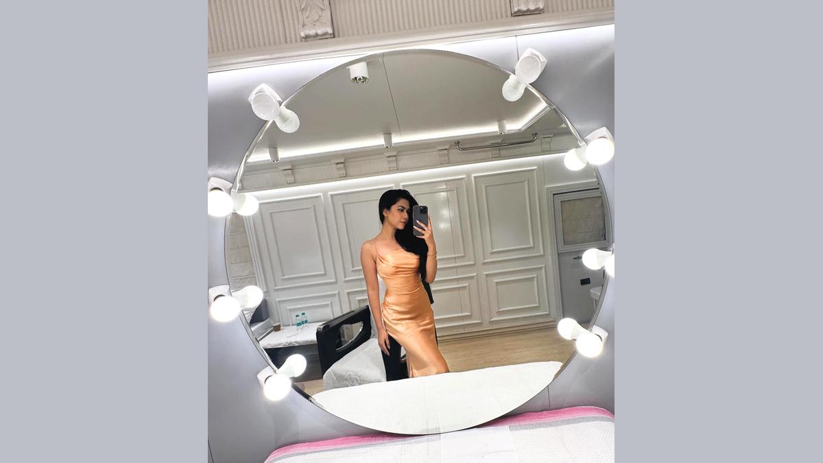 satin dress -- just look at that lit mirror selfie.