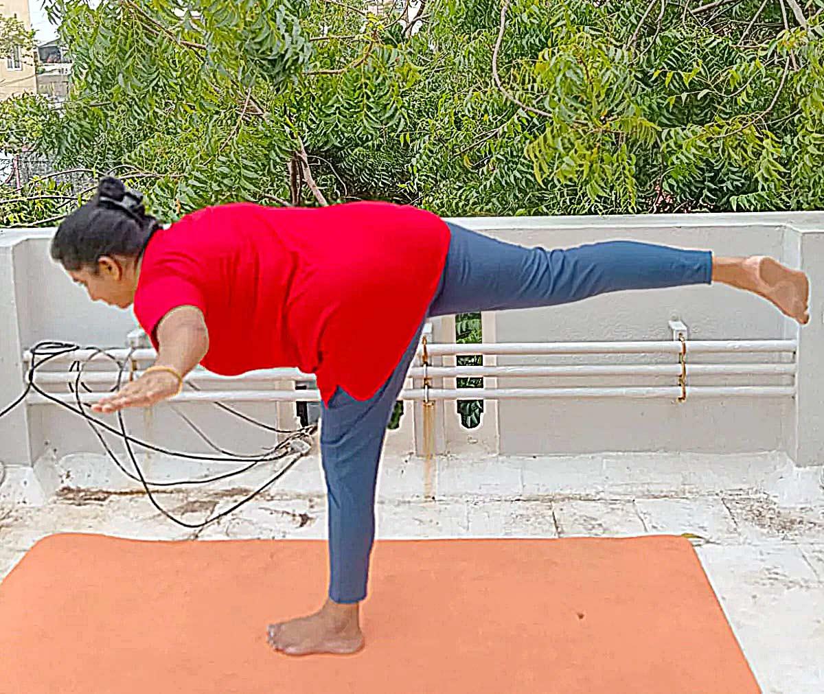 Raise the other leg and extend it backwards: Lift your other leg straight behind you, keeping it parallel to the ground, as you bend forwards.