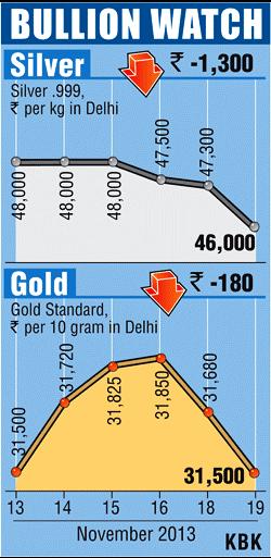 Silver ready tumbled by Rs 1,300 to Rs 46,000 per kg and weekly-based delivery by Rs 1,420 to Rs 45,170 per kg.