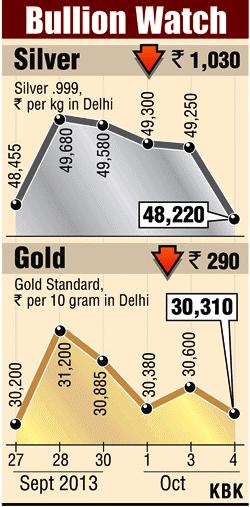 Silver also tumbled by Rs 1,030 to Rs 48,220 per kg in continuation of a loss of Rs 430 in last three sessions on reduced offtake by industrial units.