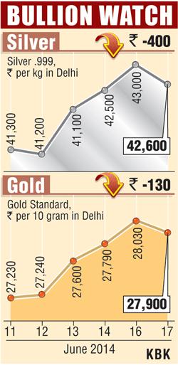 In a similar fashion, silver ready declined by Rs 400 to Rs 42,600 per kg and weekly-based delivery by Rs 275 to Rs 42,050 per kg, after gaining Rs 1,800 in the previous three sessions.
