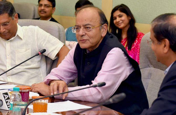IMAGE: Union Finance Minister Arun Jaitley speaks during an event in New Delhi on Friday. Photograph: Atul Yadav/PTI Photo