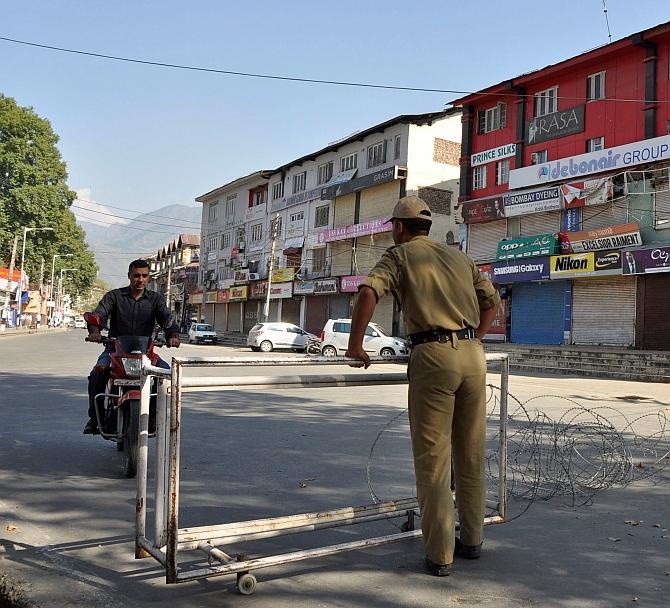 IMAGE: A policeman stops a biker at a blocked road during the 74th day of curfew and restrictions in Srinagar. Photograph: Umar Ganie