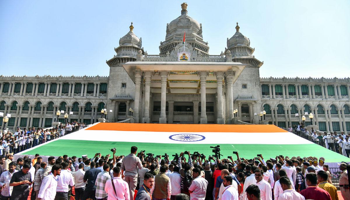 The worlds second-largest khadi Tricolour was unveiled at the Suvarna Soudha in Belagavi on Tuesday, December 9, 2025. IMAGE: The worlds second-largest khadi Tricolour. Photographs: ANI Photo IMAGE: Karnataka Chief Minister Siddaramaiah along with Deputy CM D K Shivakumar unveiled the worlds second-largest khadi Tiranga. Photographs curated by Anant Salvi/RediffFeature Presentation: Ashish Narsale/Rediff