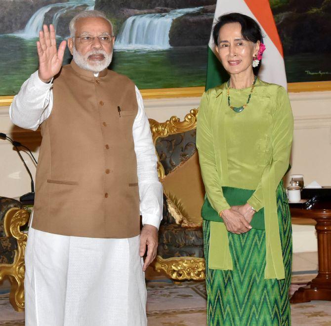 IMAGE: Prime Minister Narendra Modi with the State Counsellor of Myanmar Aung San Suu Kyi at Presidential Palace in Nay Pyi Taw, Myanmar. Photograph: PIB