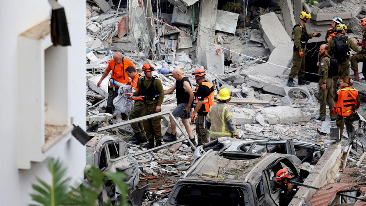 IMAGE: First responders work at an impact site. Photograph: Itai Ron/Reuters
