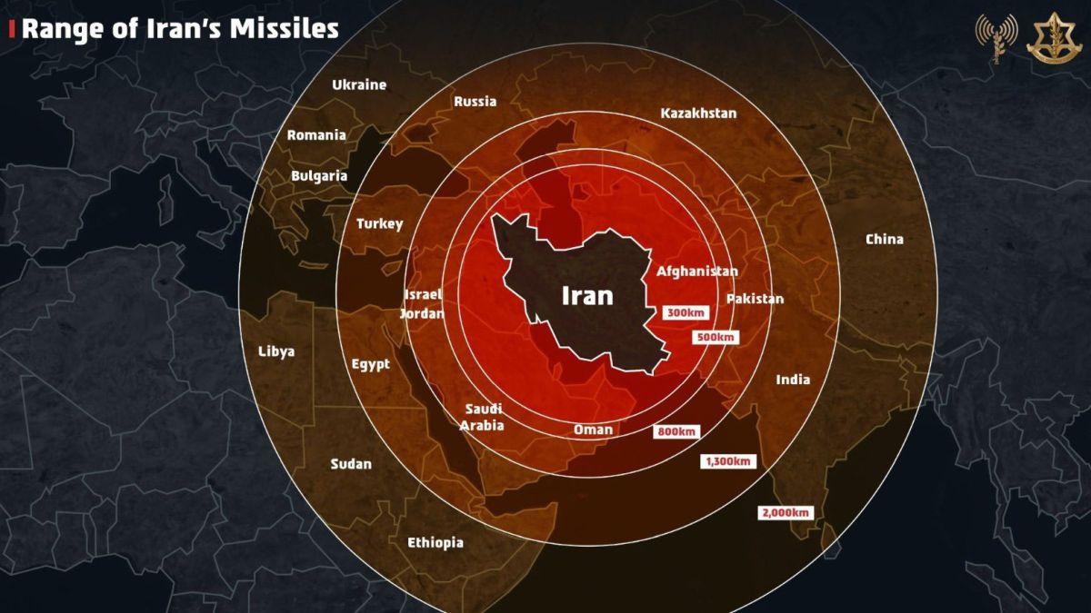 It contained a graphic showing concentric red circles emanating from Iran and shading large parts of West Asia, northern Africa, Europe and Asia, including India, China, Saudi Arabia, Libya, Ethiopia, Romania, Bulgaria, Kazakhstan, Turkey, and Russia.