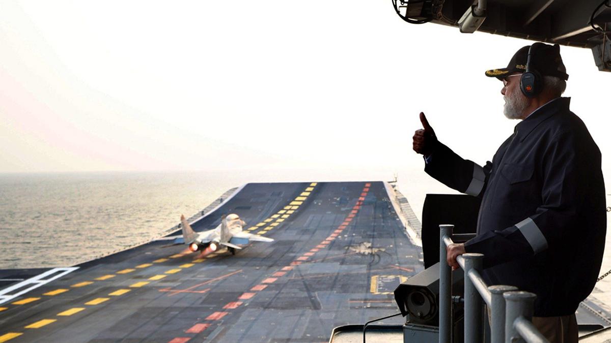 IMAGE: 'Witnessed an awe-inspiring Air Power Demo on INS Vikrant, showcasing precision and prowess,' Modi tweeted.