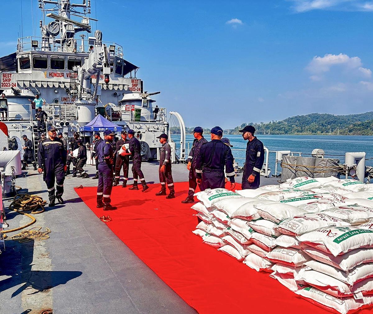 As per the defence ministry, approximately 52 tons of relief material have been embarked on board these ships, including HADR pallets consisting of essential clothing, drinking water, food, medicines, and emergency stores.