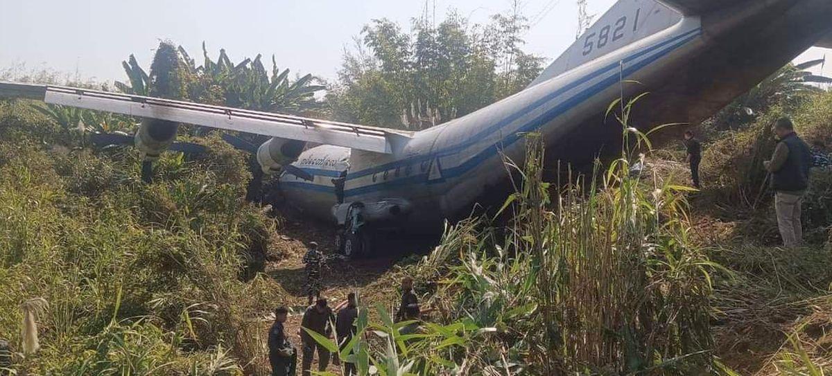 Officials said the Myanmar air force Y-8 cargo plane overshot the tabletop runway of the Mizoram government-run airport around 10.20 am and crash-landed into a nearby bush, splitting the bottom of the fuselage.