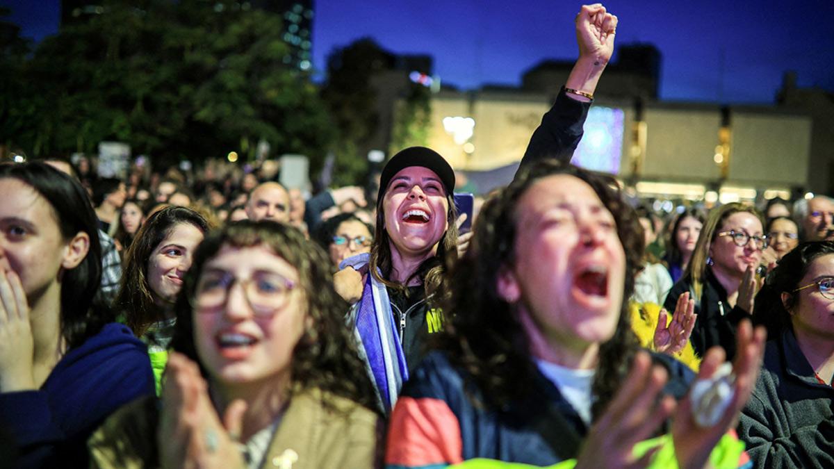 IMAGE: Joyous Israelis in Tel Aviv, January 19, 2025, watch news coverage of the release of Romi Gonen, Doron Steinbrecher and Emily Damari, three female hostages who have been held in Gaza since the deadly October 7 2023 attack, as part of a ceasefire deal in Gaza between Hamas and Israel. Photograph: Itai Ron/Reuters