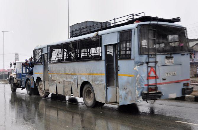 The attacked bus was the fifth in the convoy of 78 vehicles which also included as many as 16 bullet-proof protection bunker vehicles that had joined the convoy an hour back from the last halt spot of Qazigund to guard troop movement.