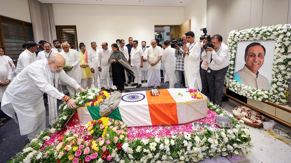 Earlier in the day, Rupani's mortal remains were handed over to his family members in Ahmedabad with guard of honour in the presence of Chief Minister Bhupendra Patel. The body was brought to Rajkot on a special plane.