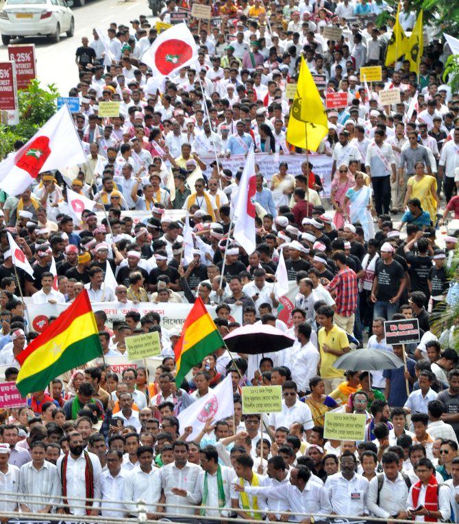 IMAGE: Members of All Assam Students Union and others participate in a protest rally taken out against the Citizenship (Amendment) Bill 2016 in Guwahati last week.