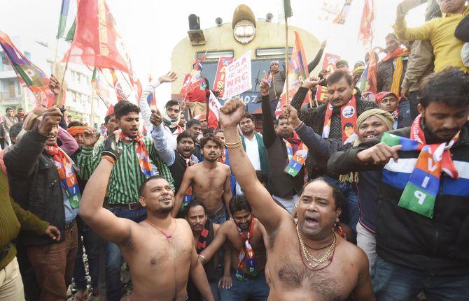 In the state capital, activists belonging to pro-Left student bodies like All India Students Federation and All India Students Association stormed the Rajendra Nagar Terminus and squatted on the tracks disrupting movement of trains for about half an hour early in the morning.