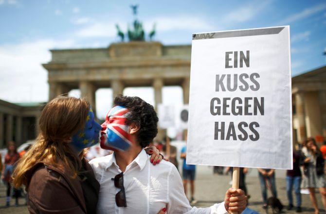 Two activists with the European Union flag and Union Jack painted on their faces kiss each other in front of Brandenburg Gate to protest against British exit from the EU, in Berlin, Germany. The sign reads, "A kiss against hate". Photograph: Hannibal Hanschke/Reuters