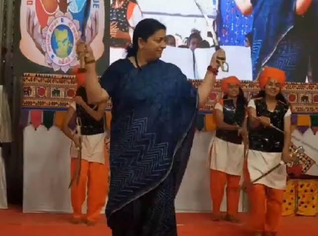 Union minister Smriti Irani performed 'Talwar Raas', a traditional dance form using swords, at a cultural programme in Bhavnagar on Friday.