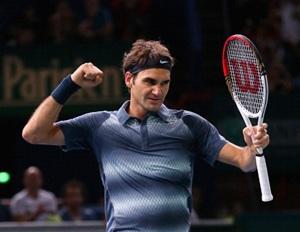 Image: Roger Federer celebrates defeating Juan Martin Del Potro on Day 5 of the BNP Paribas Masters at Palais Omnisports de Bercy.