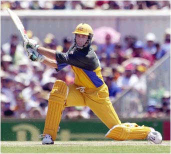 Michael Bevan drives through the covers during his innings of 44.