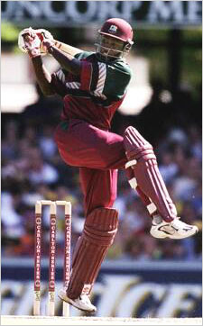 Old Waugh horseWavell Hinds pulls through mid-wicket during his innings of 54 from 72 balls. Hinds showed the tenacity and guts to on-drive McGrath down the ground to complete his half-century. Hinds failed to get to the pitch of a Warne delivery and pushed a low return catch.Nick Wilson/ALLSPORT |