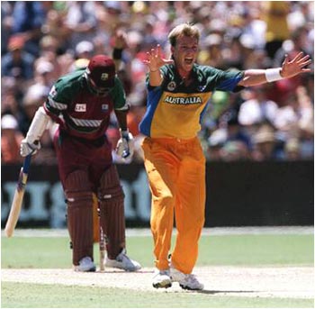 Australia vs West IndiesBrett Lee traps Brian Lara plumb in front of the first ball for nought during the Carlton Series One Day International between Australia and West Indies at the Adelaide Oval.Hamish Blair/ALLSPORT |