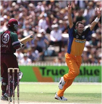 Damien Fleming celebrates the wicket of Darren Ganga caught by Shane Warne for nought.