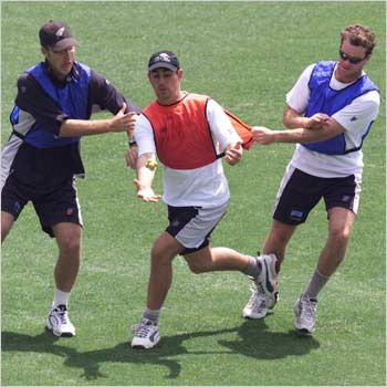 Daniel Vettori, Matthew Sinclair and Dion Nash (left to right) of New Zealand in action during a team training session held at the Gabba, Brisbane, Australia.