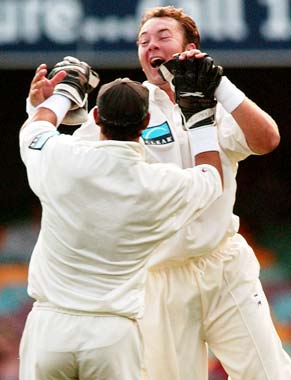 Craig McMillan of New Zealand celebrates with wicket keeper Adam Parore after taking a wicket. He led a New Zealand fightback with three wickets in the final session.