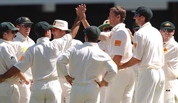 Glenn McGrath celebrates with team mates after getting the wicket of Matthew Bell for five runs during day five.