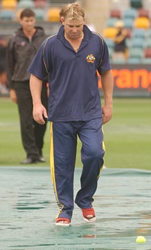 Shane Warne retrieves a tennis ball from the covers while waiting for rain to clear during day three of the first cricket Test between Australia and New Zealand held at the Gabba, Brisbane, Australia.