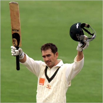 Langer celebrates after scoring his third successive century. He became the first Australian to record the feat since David Boon in 1993.