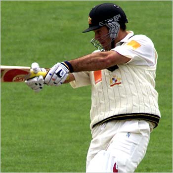 Ricky Ponting takes on the charge with Shane Warne at the fag end of Day 1, scoring 92 runs off 121 deliveries, with 14 boundaries.
