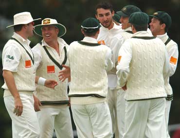 The Australian team celebrate after taking the wicket of Matthew Sinclair bowled by Jason Gillespie on 23.
