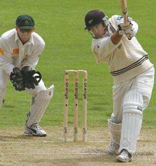 Craig McMillan drives a ball from Shane Warne as Adam Gilchrist looks on.
