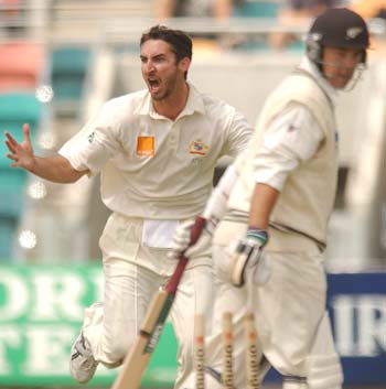Jason Gillespie celebrates bowling out Craig McMillan on 55.