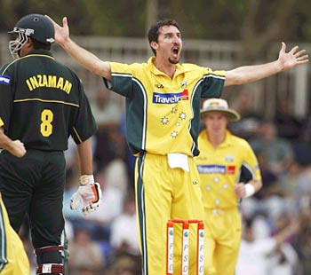 Gillespie celebrates after taking the wicket of Inzamam-ul-Haq, LBW for a duck.