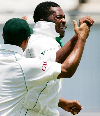 South Africa fast bowler Makhaya Ntini celebrates after getting the wicket of India opener Wasim Jaffer on day one of the first Test at the Wanderers Stadium in Johannesburg, on Friday.