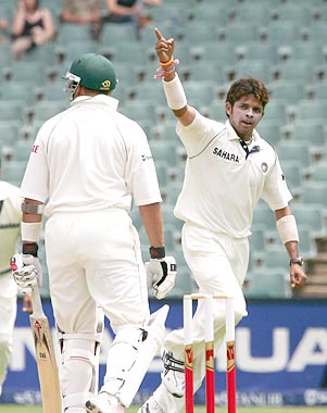 Sreesanth celebrates the wicket of Kallis who was caught in the second slip by Laxman for 12.