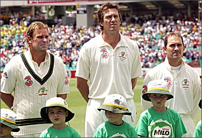 Shane Warne (left), Glenn McGrath (c) and Justin Langer listen to the national anthems being played before the start of the fifth and final Ashes Test at the Sydney Cricket Ground on Tuesday.