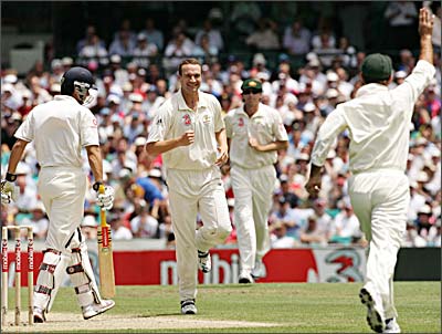 Stuart Clark (centre) celebrates after dismissing Alastair Cook (left).