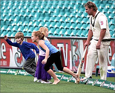 Shane Warne watches as his son Jackson (left) and daughter Brooke (second left) race off while speaking with daughter Summer, as he plays a game of cricket with his children after the day's play.