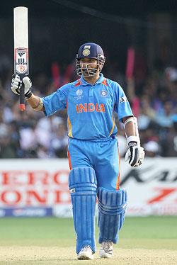 Image: Sachin Tendulkar celebrates after completing his century.