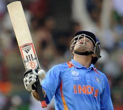 Image: Tendulkar raises his bat after completing his fifty. (Reuters)