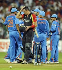 Image: Kevin Pietersen walks off the field after being dismissal by Munaf Patel. (Reuters)